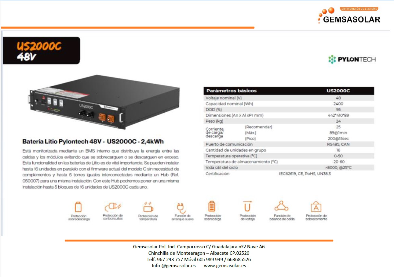 La batería de litio pylontech us 2000C funciona a 48 voltios y dispone de un BMS (sistema de monitorización de la batería) que tiene funciones de compensación de carga entre las celdas , de gestión entre varios módulos pylontech y de protección frente a bajas y altas temperaturas (0-50ºC).